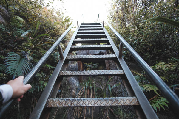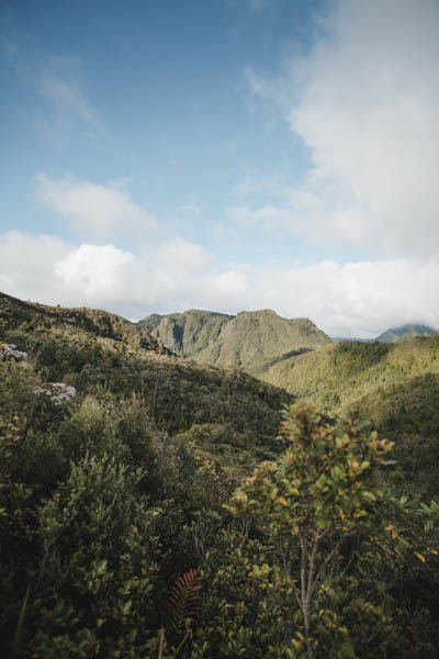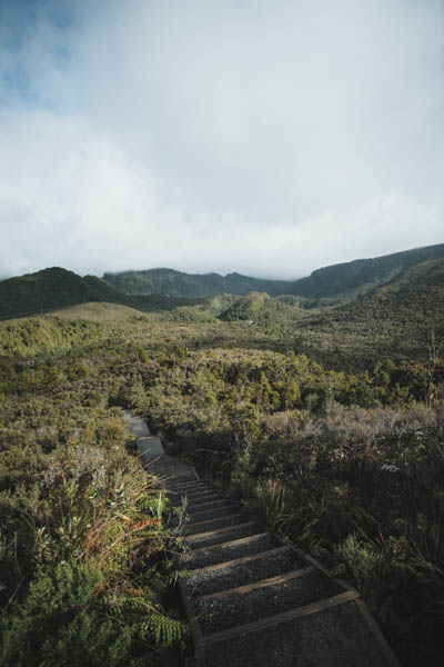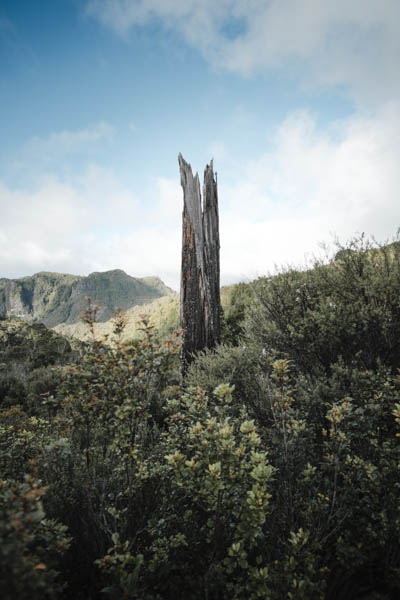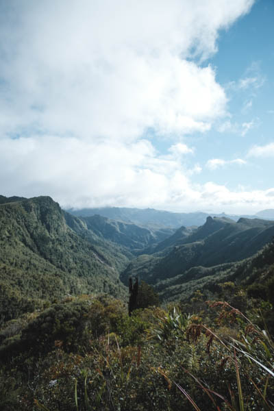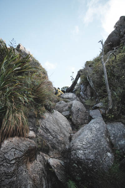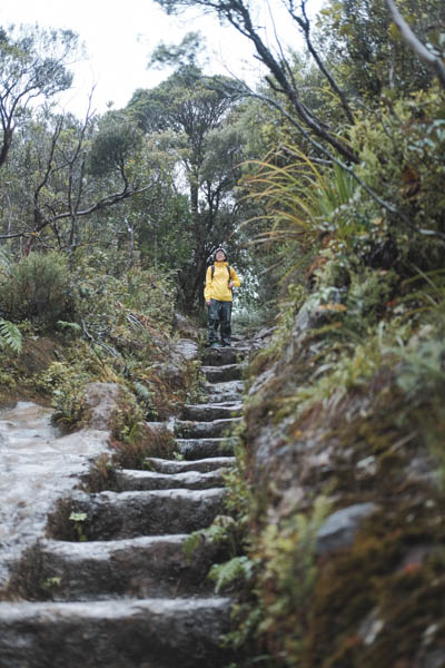 Bagian bawah gunung banyak ‘fern’. Hutan tidak terlalu tinggi tapi lumayan menutup dibagian atas, jadi kalau sedang cerah tidak terlalu panas, tetapi kali ini sedang hujan. Banyak melewati jembatan dan sungai. Pemandangan tentu saja bagus. Tidak terlau menanjak, banyak bonus dan turunan. Ada beberapa ruter alternatif kecil untuk menghindari sungai yang sedang naik. Jalan sekitar 2 jam sampai Hydro Camp, lokasi untuk berkemah di dekat sungai. Sekitar 1 jam lagi sampai Pinncale Hut. Kalau sedang hujan terus seperti sekarang ini, jalanan agak becek.