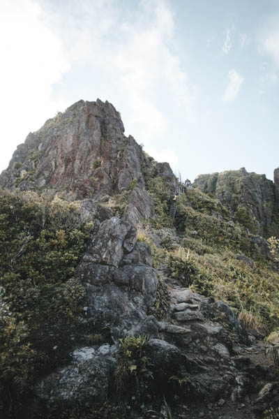 Perjalanan ke puncak lumayan menanjak, sekitar 40 menit bisa sampai puncak. Harus naik-naik tangga karena memang berbatu dan tebing-tebing.